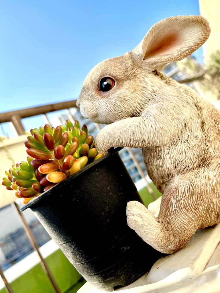 ウサギさんに抱かれて快晴の空の下、虹の玉も冬仕様に衣替えをしているようです。
